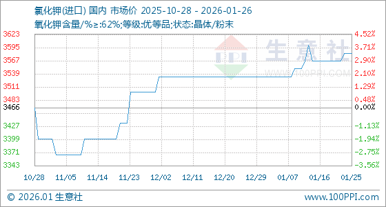 1月26日,生意社氯化钾(进口)基准价为3583.33元/吨,与本月初(3533.33元/吨)相比,上涨了1.42%。