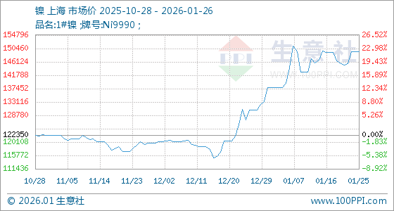 1月26日,生意社镍基准价为149416.67元/吨,与本月初(137733.33元/吨)相比,上涨了8.48%。