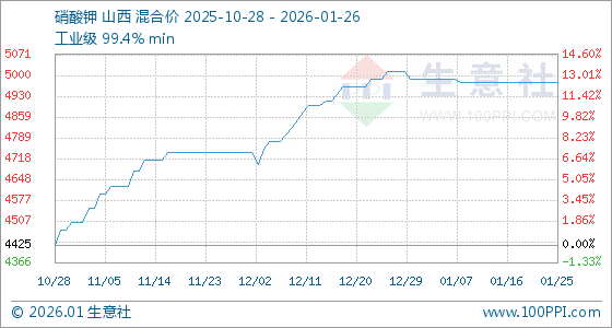 1月26日,生意社硝酸钾基准价为4975.00元/吨,与本月初(4987.50元/吨)相比,下降了0.25%。