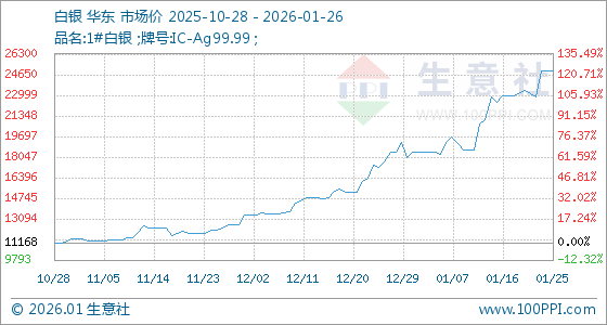 1月26日,生意社白银基准价为24925.33元/千克,与本月初(18480.00元/千克)相比,上涨了34.88%。
