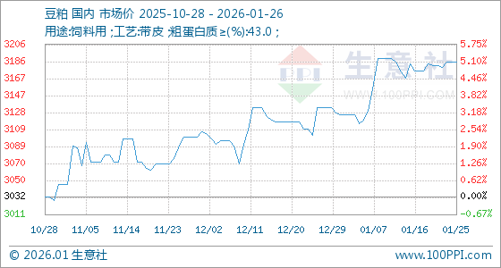 1月26日,生意社豆粕基准价为3186.00元/吨,与本月初(3126.00元/吨)相比,上涨了1.92%。