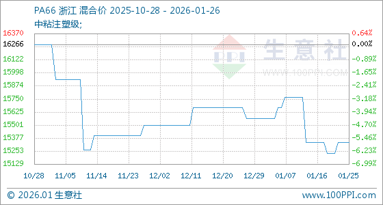 1月26日,生意社PA66基准价为15333.33元/吨,与本月初(15566.67元/吨)相比,下降了1.5%。