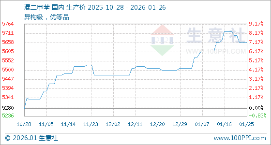 1月26日,生意社混二甲苯基准价为5660.00元/吨,与本月初(5510.00元/吨)相比,上涨了2.72%。
