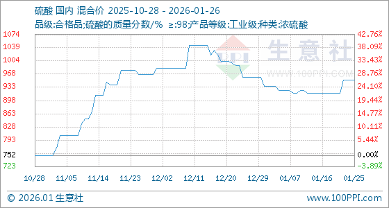 1月26日,生意社硫酸基准价为952.50元/吨,与本月初(937.50元/吨)相比,上涨了1.60%。