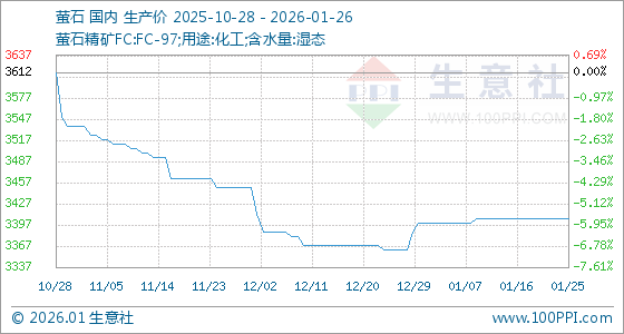 1月26日,生意社萤石基准价为3406.25元/吨,与本月初(3400.00元/吨)相比,上涨了0.18%。