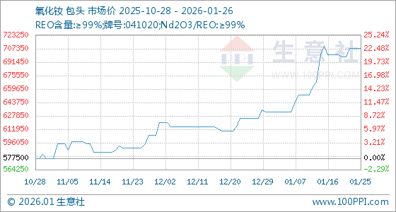 1月26日,生意社氧化钕基准价为707500.00元/吨,与本月初(632500.00元/吨)相比,上涨了11.86%。