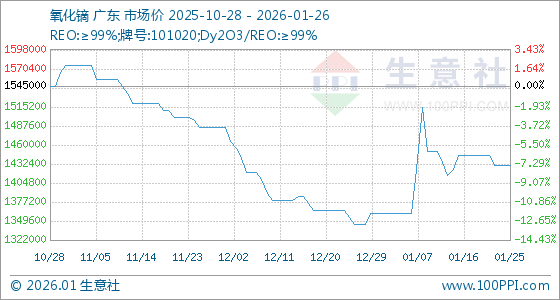 1月26日,生意社氧化镝基准价为1430000.00元/吨,与本月初(1360000.00元/吨)相比,上涨了5.15%。