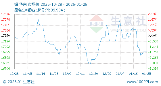 1月26日,生意社铅基准价为17010.00元/吨,与本月初(17205.00元/吨)相比,下降了1.13%。