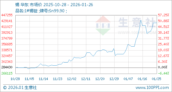 1月26日,生意社锡基准价为423730.00元/吨,与本月初(326340.00元/吨)相比,上涨了29.84%。