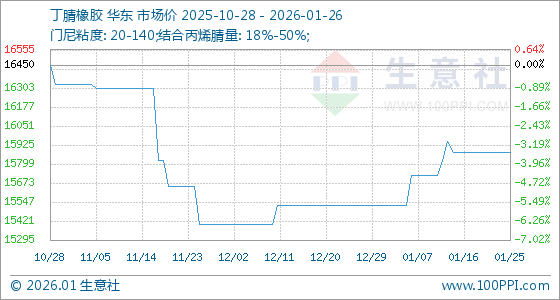1月26日,生意社丁腈橡胶基准价为15875.00元/吨,与本月初(15525.00元/吨)相比,上涨了2.25%。