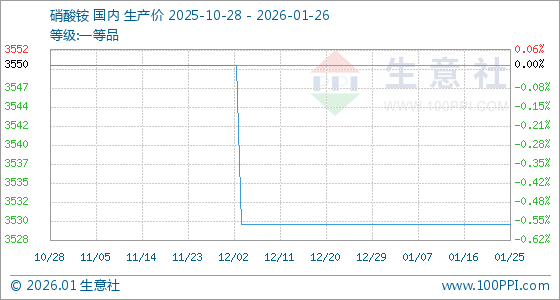 1月26日,生意社硝酸铵基准价为3530.00元/吨,与本月初持平。