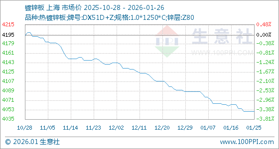1月26日,生意社镀锌板基准价为4050.00元/吨,与本月初(4087.50元/吨)相比,下降了0.92%。