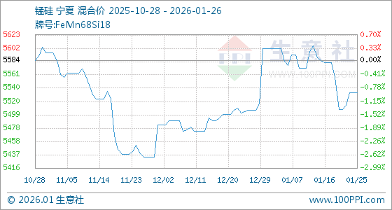1月26日,生意社锰硅基准价为5534.00元/吨,与本月初(5602.00元/吨)相比,下降了1.21%。