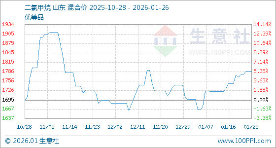 1月26日,生意社二氯甲烷基准价为1787.50元/吨,与本月初(1697.50元/吨)相比,上涨了5.30%。