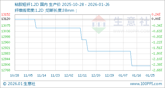 1月26日,生意社粘胶短纤1.2D基准价为12800.00元/吨,与本月初(12900.00元/吨)相比,下降了0.78%。