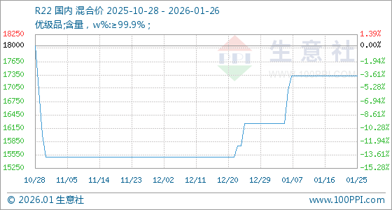 1月26日,生意社R22基准价为17333.33元/吨,与本月初(16250.00元/吨)相比,上涨了6.67%。