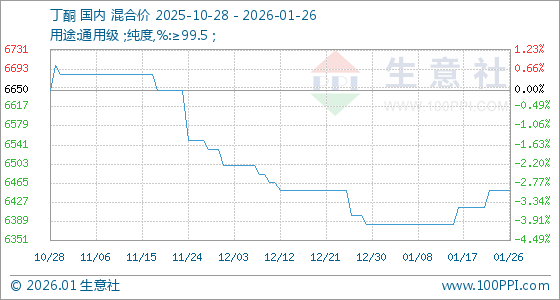 1月26日,生意社丁酮基准价为6450.00元/吨,与本月初(6383.33元/吨)相比,上涨了1.04%。