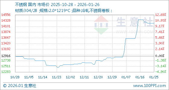 1月26日,生意社不锈钢基准价为14223.33元/吨,与本月初(12873.33元/吨)相比,上涨了10.49%。