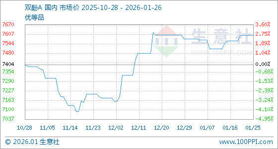 1月26日,生意社双酚A基准价为7600.00元/吨,与本月初(7576.00元/吨)相比,上涨了0.32%。