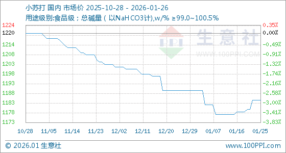 1月26日,生意社小苏打基准价为1185.00元/吨,与本月初(1190.00元/吨)相比,下降了0.42%。