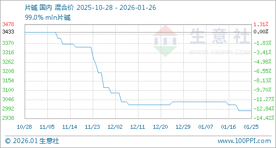 1月26日,生意社片碱基准价为2983.33元/吨,与本月初(3033.33元/吨)相比,下降了1.65%。