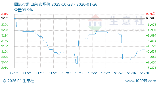 1月26日,生意社四氯乙烯基准价为3111.11元/吨,与本月初(3205.00元/吨)相比,下降了2.93%。