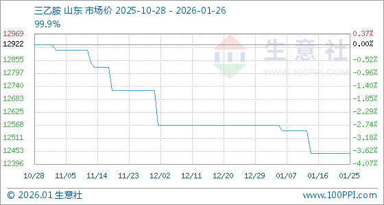 1月26日,生意社三乙胺基准价为12444.44元/吨,与本月初(12566.67元/吨)相比,下降了0.97%。
