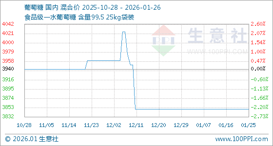 1月26日,生意社葡萄糖基准价为3850.00元/吨,与本月初持平。