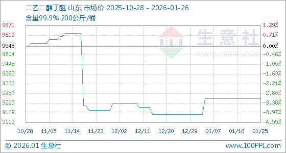 1月26日,生意社二乙二醇丁醚基准价为9250.00元/吨,与本月初(9160.00元/吨)相比,上涨了0.98%。