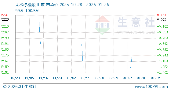 1月26日,生意社无水柠檬酸基准价为5175.00元/吨,与本月初(5158.33元/吨)相比,上涨了0.32%。
