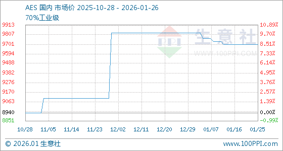 1月26日,生意社AES基准价为9700.00元/吨,与本月初(9825.00元/吨)相比,下降了1.27%。