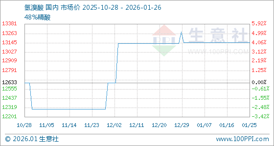 1月26日,生意社氢溴酸基准价为13150.00元/吨,与本月初持平。