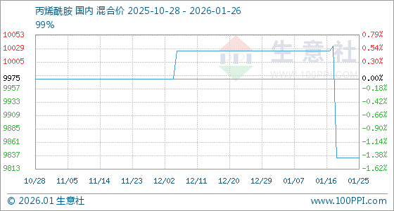 1月26日,生意社丙烯酰胺基准价为9833.33元/吨,与本月初(10025.00元/吨)相比,下降了1.91%。