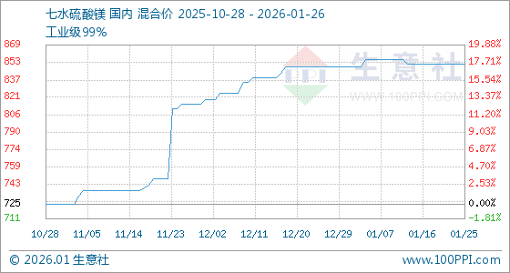 1月26日,生意社七水硫酸镁基准价为852.00元/吨,与本月初(850.00元/吨)相比,上涨了0.24%。