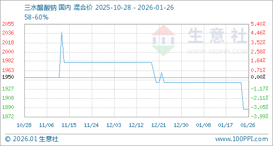 1月26日,生意社三水醋酸钠基准价为1887.50元/吨,与本月初(1940.00元/吨)相比,下降了2.71%。