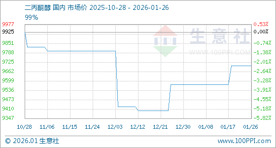 1月26日,生意社二丙酮醇基准价为9700.00元/吨,与本月初(9575.00元/吨)相比,上涨了1.31%。
