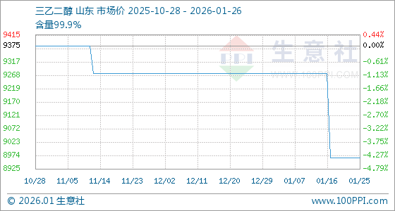 1月26日,生意社三乙二醇基准价为8966.67元/吨,与本月初(9275.00元/吨)相比,下降了3.32%。