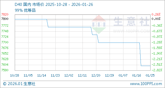 1月26日,生意社D40基准价为7600.00元/吨,与本月初(7700.00元/吨)相比,下降了1.3%。