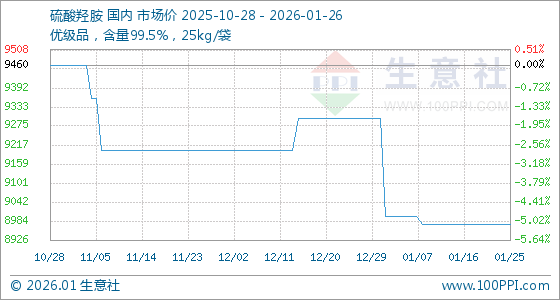 1月26日,生意社硫酸羟胺基准价为8975.00元/吨,与本月初(9300.00元/吨)相比,下降了3.49%。