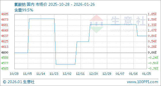 1月26日,生意社氯酸钠基准价为4637.50元/吨,与本月初(4662.50元/吨)相比,下降了0.54%。
