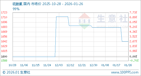 1月26日,生意社硫酰氯基准价为1643.33元/吨,与本月初(1682.50元/吨)相比,下降了2.33%。