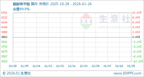 1月26日,生意社醋酸精甲酯基准价为3910.00元/吨,与本月初持平。