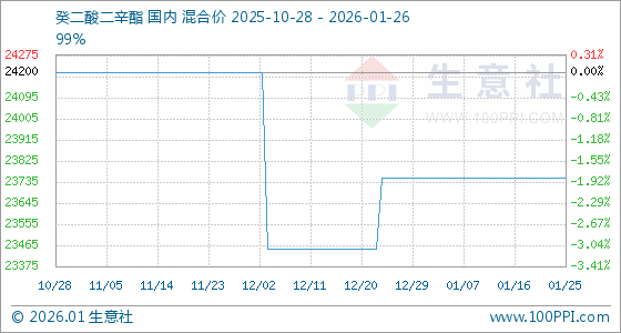 1月26日,生意社癸二酸二辛酯基准价为23750.00元/吨,与本月初持平。