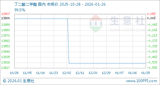 1月26日,生意社丁二酸二甲酯基准价为13825.00元/吨,与本月初持平。