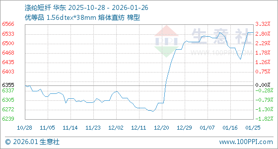 1月26日,生意社涤纶短纤基准价为6539.03元/吨,与本月初(6507.33元/吨)相比,上涨了0.49%。