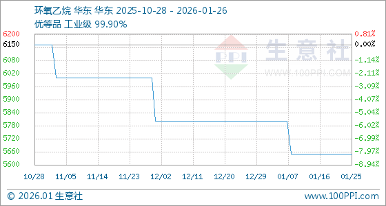 1月26日,生意社环氧乙烷基准价为5650.00元/吨,与本月初(5800.00元/吨)相比,下降了2.59%。