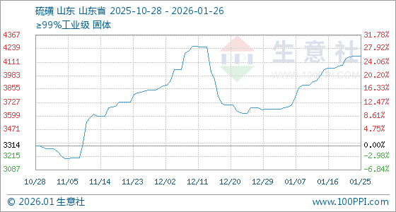1月26日,生意社硫磺基准价为4166.67元/吨,与本月初(3661.00元/吨)相比,上涨了13.81%。