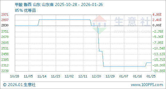 1月26日,生意社甲酸基准价为2350.00元/吨,与本月初(2300.00元/吨)相比,上涨了2.17%。