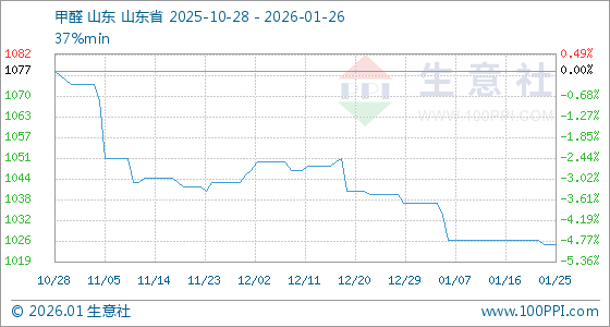 1月26日,生意社甲醛基准价为1025.00元/吨,与本月初(1037.50元/吨)相比,下降了1.2%。