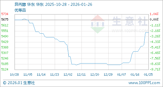 1月26日,生意社异丙醇基准价为5533.34元/吨,与本月初(5176.66元/吨)相比,上涨了6.89%。